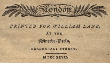William Lane, a London printer and publisher, began publishing under his own name in the 1780s, but around 1790 his books began to carry the imprint of the “Minerva Press,” a somewhat ironic name, since Minerva was the Greek goddess of wisdom, and the Minerva Press was routinely decried by literary critics for the lowbrow literature it published. Although most publishers today have branded their presses (think Penguin, for example), creating the Minerva brand for his titles was a clever and innovative marketing move for its time, as was Lane’s formation of a circulating library, where he could lend out his books on subscription to those who couldn’t afford to pay for them outright.